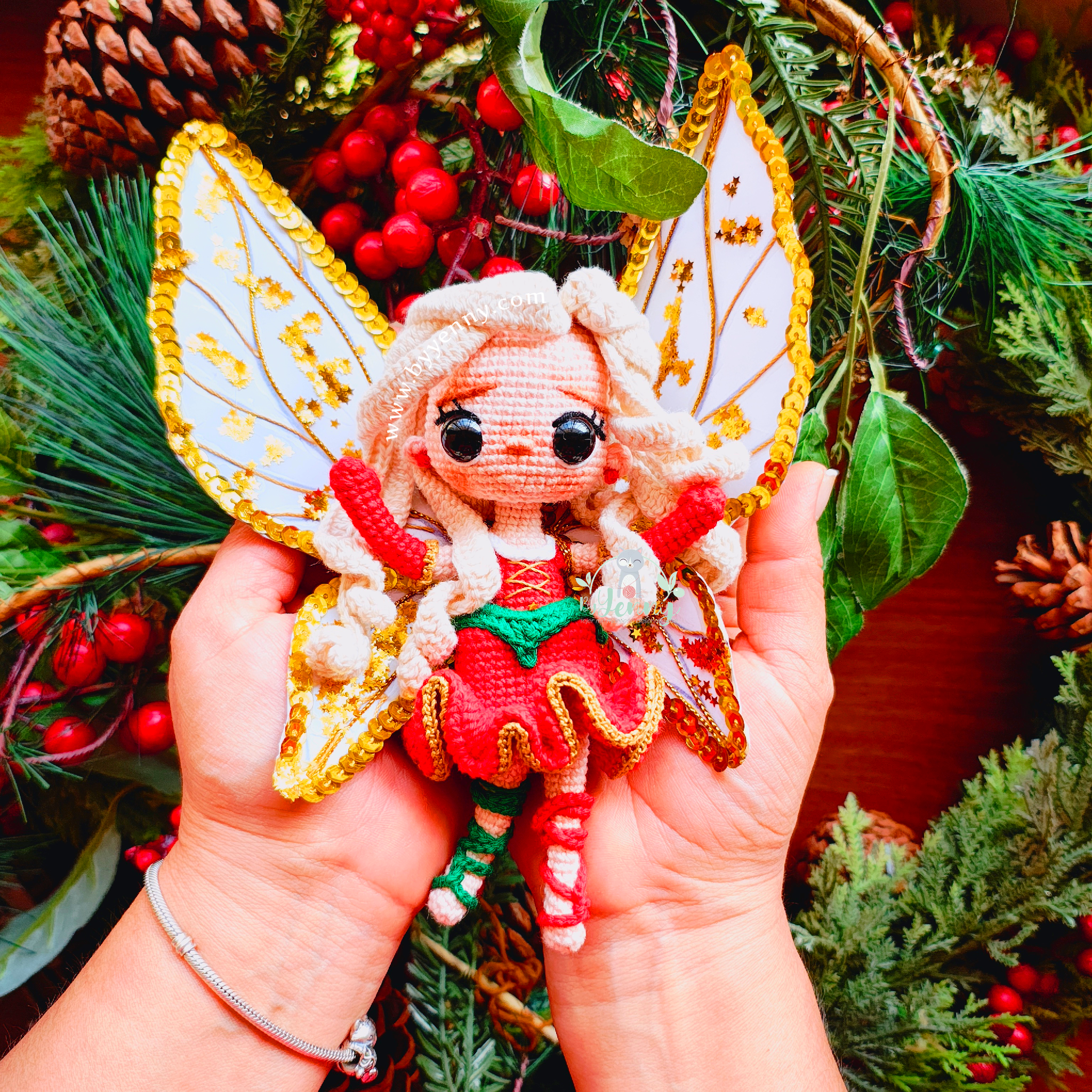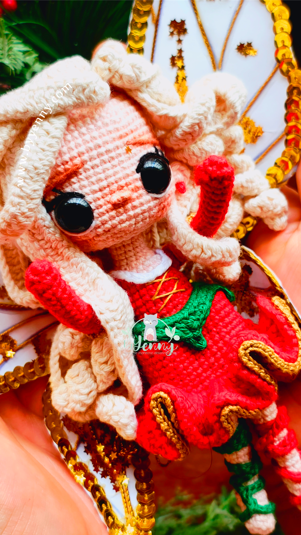 Con sus rizos suaves, su vestidito festivo y sus alas doradas llenas de detalles, cada parte de ella está tejida para hacerte suspirar. 🧚♀️💛